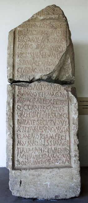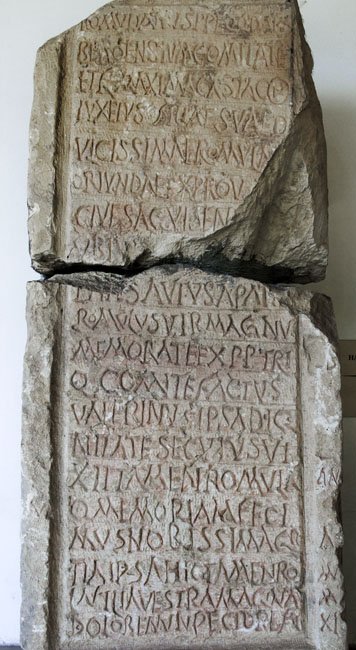 - Romulianus p(rae)p(ositus?) [---] / Beroe(e)nsium comitate / et Fl(avia) Maxima casta con/iux eius filiae suae d/ulcissimae Romula[e] / oriundae ex prov(incia) [---] / cives Aquisen[---] / VBIV[---] / DIIISAVIVSAPAT[---] / Romulus vir magnus / memorate ex p(rae)p(osito?) TRI / Q comite factus / Valerinus ipsa dig/nitate secutus vi/xit tamen Romulan//[i]an/o memoriam feci/mus nobissima gr//a/tia ipsa hic tamen Ro//mu/[---] vestram magna//m / dolorem in PECIDRLA?//XI