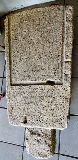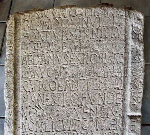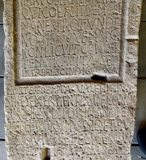 - ---] / [------] / Blando invidit / fortuna tantorum / disiungere pacto / aedamus ex nobis tre(s) / parvos pignora natos / qui colant memoria / manes profundere / nobis quem sic / non licuit complere / tempor(a) avita sed / ixta falso indigna // morte perempta vale mihi Ur/sine semper pientissime coniu/nx hic Victorina nomen / tenebrorum possidet au/ras vivite feleces (!) qui/bus est fortuna beata