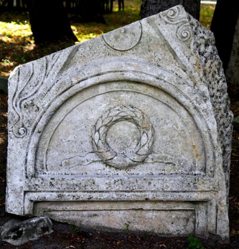 - Über dem gerahmten Schriftfeld Bogennische mit Kranz mit Tänien. Über dem Bogen Giebelfeld mit Schale oder Rundschild(?), seitlich davon Palmettenakrotere.