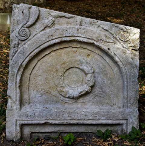 - Profiliert gerahmte Bogennische, darin Kranz mit Tänien. Seitlich über dem Bogen Mohnstängel und Halbpalmetten. Unten Ansatz eines gerahmten Schriftfeldes.