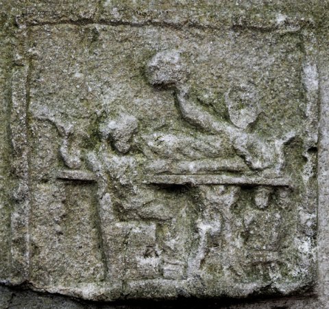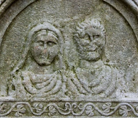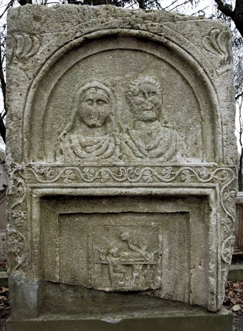 - Oben Bogennische mit zwei Büsten (Ehepaar). Frau mit Schleier, bärtiger Mann im Sagum. Seitlich des Bogens Halbpalmetten. Unter den Porträts profiliert gerahmtes Feld mit Weinranke auf der äußeren Rahmenleiste. Im Inneren einfach gerahmtes Bildfeld mit Totenmahl (Mann auf Kline, Frau auf Sessel, Tisch, Diener).