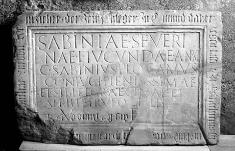 - Sabiniae Severi/nae l(ibertae) Iucundae an(norum) XL / C(aius) Sabinius Plocamus / coniugi pientissimae / et sib(i) et Graecinae et / Aprili et Rufo fili(i)s / v(ivus) f(ecit)