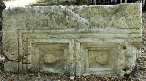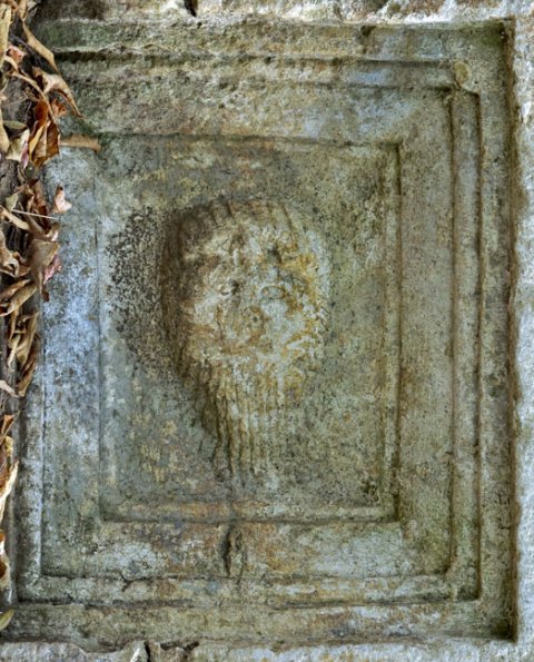 - Decke mit profiliert gerahmten rechteckigen Kassetten, darin Köpfe (erhalten ein bärtiger Männer- und ein Jünglingskopf). Vom selben Gebäude wie Nr. 20871 ?