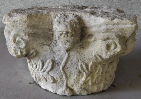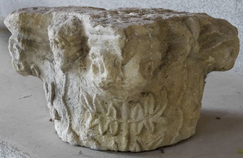 - Korinthisierendes Kapitell mit umlaufenden Blattranken und Pflanzenstängel mit menschlichem Kopf bzw. Blüten zwischen den Voluten.