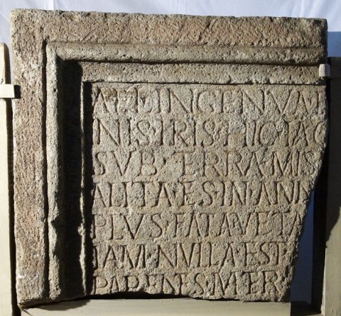 - Ael(ia) Ingenua E[---]/inis Iris hic iac[et ---] / sub terra mis[era? ---] / alita es in ann[is ---] / plus fata veta[runt ---] / iam nulla est [---] / parentes mater [---]