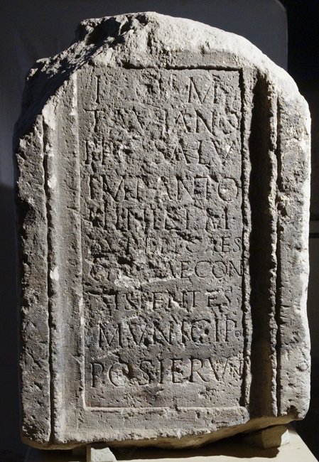 - I(ovi) O(ptimo) M(aximo) / Taviano / pro salu(te) / Imp(eratoris) Anto/nini et M(arci) / Aureli Caes(aris) / Gal[at]ae con/sistentes / municipio / posierunt (!)