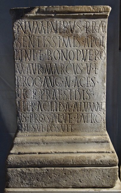- Numinibus prae/sentissimis Apol/lini et Bono Puero / M(arcus) Aur(elius) Marcus v(ir) e(gregius) / proc(urator) Aug(usti) n(ostri) age(n)s / vice praesidis / Heraclida alumn/us pro salute patro/ni sui posuit