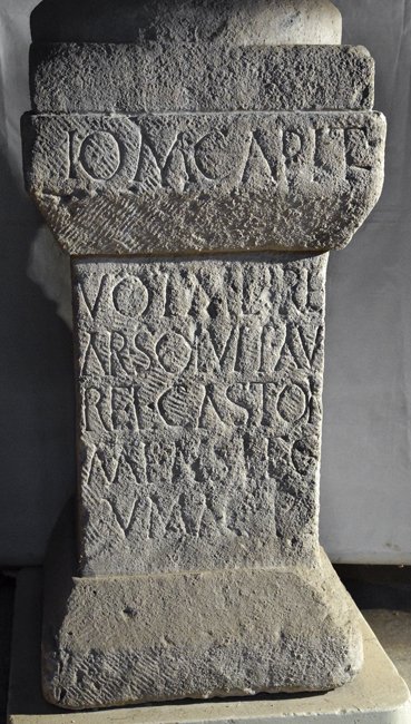 - I(ovi) O(ptimo) M(aximo) Capit(olino) / vot(u)m libe(ns) / a<n>(imo?) solvit Au/rel(ius) Castor / mens(or) leg(ionis) / V Mac(edonicae) p(iae)