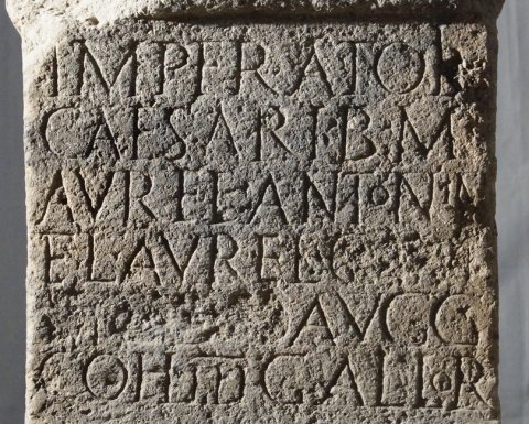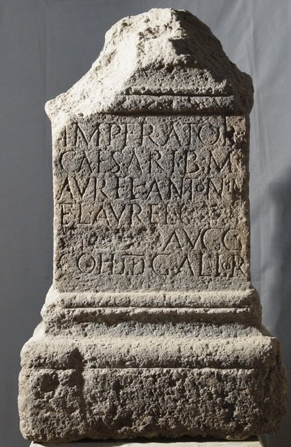 - Imperatori(bus) / Caesarib(us) M(arco) / Aurel(io) Antonin(o) / et L(ucio) Aurel(io) [[C[o]m]]/[[m[od]o]] Augg(ustis) / coh(ors) III Gallor(um)