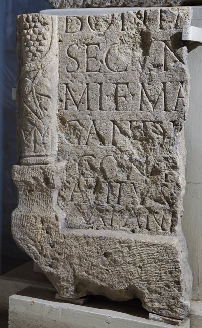 - [D(is)] M(anibus) Ul[pius] / Bonia[tus eques(?)] / Secun[da Maxi]/mi f(ilia) ma[ter et Ulp(ia?)] / Candi[da fil(io) et] / con(iugi) b(ene) [m(erenti) ---] / Avitus [---] / v(i)xi(t) ann(os) [---]