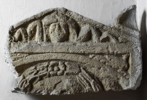 - Giebel mit Gorgoneion und Seitenakroteren. Im Bildfeld bogenförmige Rahmenleiste, darunter Rest eines Kranzes mit Rosette. In den Zwickeln über dem Bogen Akanthusblatt.