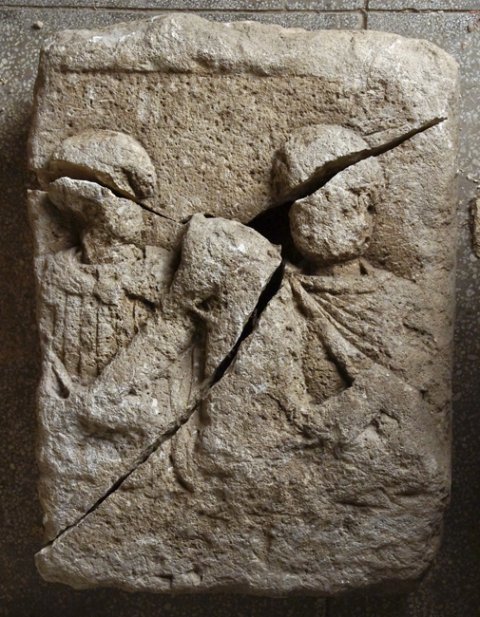 - Oberkörper von zwei Figuren, links Frau (?) mit Umhang und länglichem Objekt in den Händen, rechts bärtiger Reiter im Sagum.