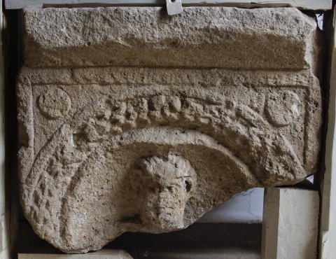 - Oben vorspringender Rahmen. Kranz, darin Muschelnische mit Kopf eines Mannes. In den Ecken oberhalb des Medaillons Scheibenrosetten.