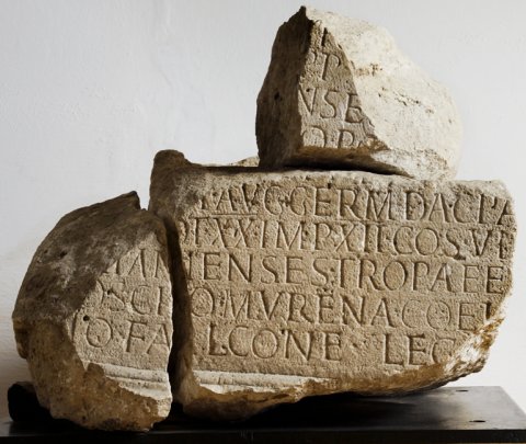 - [Imp(eratori) Caes(ari) divi Nervae f(ilio)] Ner[vae Tra]/[iano op]t(imo) Aug(usto) Germ(anico) Dac(ico) Parthic(o) [pont(ifici) max(imo)] / [trib(unicia) p]ot(estate) XX imp(eratori) XII co(n)s(uli) VI p(atri) p(atriae) / [Tra]ianenses Tropaeenses / [Q(uinto) R]oscio Murena Coelio Pom[pe]/io Falcone leg(ato) Aug(usti) pr(o) [pr(aetore)]