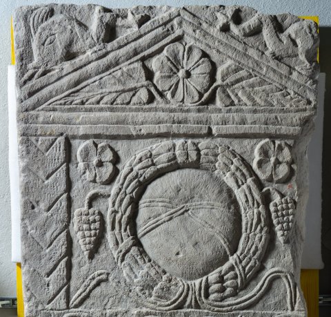 Im Hauptbild Kranz mit Tänien und zwei Weintrauben, oben zwei Rosetten.
