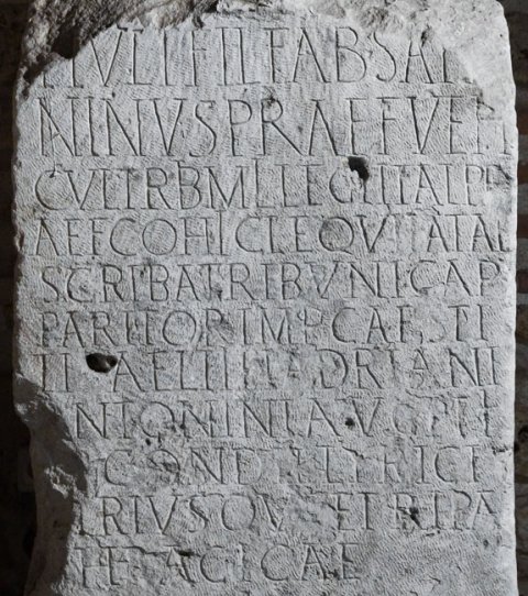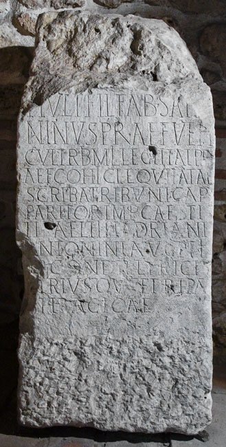 - T(itus) Iul(ius) T(iti) f(ilius) Fab(ia) Sat[ur]/ninus prae(fectus) veh(i)/cul(orum) trib(unus) mil(itum) leg(ionis) I Ital(icae) pr/aef(ectus) coh(ortis) I Cl(audiae) equitatae / scriba tribunic(ius) ap/paritor Imp(eratoris) Caes(aris) Ti/ti Aelii Hadriani / Antonini Aug(usti) Pii / [p(atris) p(atriae)] cond(uctor) Illyrici / [u]triusq(ue) et Ripae / Thracicae