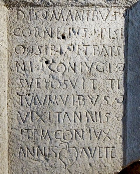 - Dis Manibus / Cornelius Pisi/o sibi et Batsi/ni coniugi / su(a)e posuit ti/tulum vibus(!) / vixit annis / item coniux / annis avete