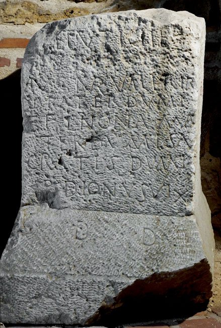 - ---] / ETVTIC[---]F / [[[------]]] / Aug(usti) Aur(elius) Valeria[n]/[u]s pater dumi / et Fl(avia) Nona ma/ter dumi sa/cratis dum<i> / [cu]r(ante)(?) Dionus(io?)(!) vix(illario)(!) // d(ederunt) d(edicaverunt)