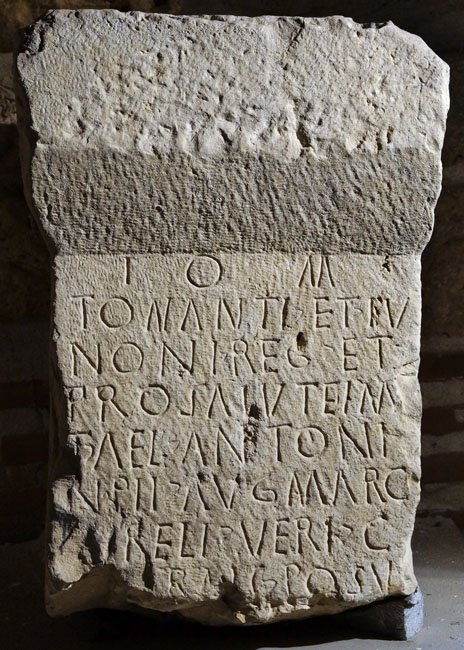 - I(ovi) O(ptimo) M(aximo) / Tonanti et Iu/noni Reg(inae) et / pro salute Im[p(eratoris)] / T(iti) Ael(i) Antoni/n(i) Pii Aug(usti) Marc(i) / [A]ureli Veri C/[ae]sarais(!) posu/[---
