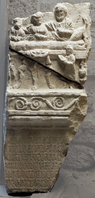 - in den Gewölben unter dem Mosaikbau (linkes Randfragment der Stele in Bukarest, Mus. Nat. Inv. L 172)