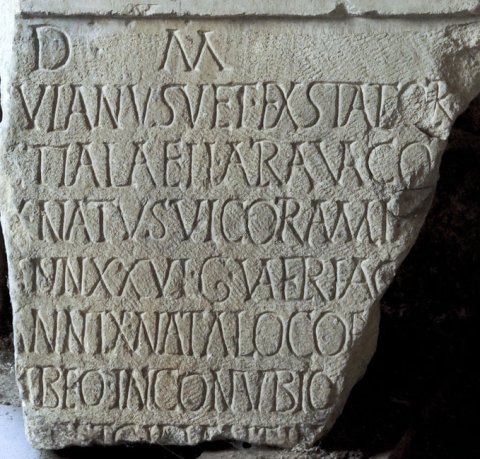 - D(is) M(anibus) / G(aius) Val(erius) Her[c]ulanus vet(eranus) ex stator[e] / praefecti alae II Aravacor(um) [vix(it)] / ann(os) L[XX] natus vico Rami[---] / militav[it a]nn(os) XXVI G(aia) Valeria C[---] / co[n(iux) vix(it) a]nn(os) LX nata loco e[odem] / qu[em ha]beo in conubio [ann(os) ---] / G(aius) Val(erius) [---] et G(aius) Val(erius) Valentin[us ---] / QVA[---] / VS[---] / STD[---] / maem[oriam? aeter]/nam [--- titu]/lum i[n --- posuerunt]