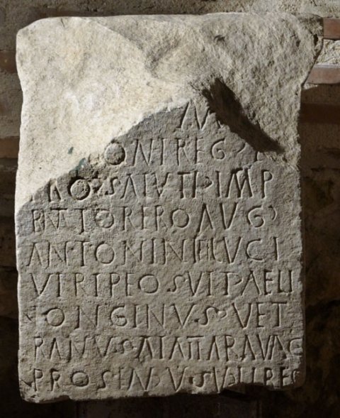 - [I(ovi) O(ptimo)] M(aximo) et / [Iun]oni Reg(inae) et / pro saluti (!) Imp/eranttorero(is)(!) Aug(usti) / Antonini et Luci / Veri peosuit(!) Aeli(us) / Longinus vet/(e)ranus ala(e) II Aravac(orum) / pro se(?) NVSV libe(n)s