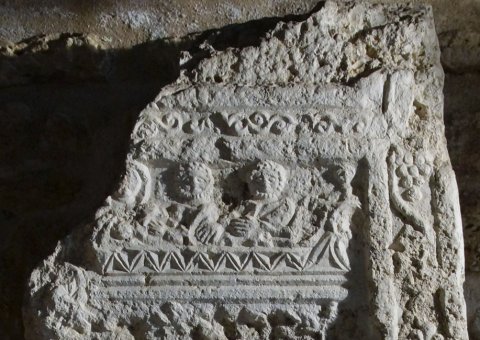 - Über dem Schriftfeld Bildfeld mit Totenmahl (zwei bärtige Männer, eine Frau auf Kline. links Dienerin, rechts über der Klinenlehne Knabenbüste). Darüber weiteres Bildfeld ? Auf den Rahmenleisten Weinranken und Spiralranken.