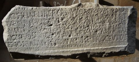 - [Pro salute Imp(eratoris) Caes(aris) M(arci) Aureli Antonini Aug(usti) et Faustinae] / [Aug(ustae) divi Antonini] Aug(usti) filiae liberorumq[ue d]omusq[ue] / [totiu]s eorum [pro]que senatu [p]opulo[q]ue [R(omano) et] ordine et / [popul]o Callatia[no]rum curam agente exactionis pecuniae / [et o]peris exstr[uc]tionisq(ue) murorum praeside provinciae / [co]nsulare(!) M(arco) [Va]lerio Bradua leg(ato) Aug(usti) pr(o) pr(aetore) civitas / Callatianorum muros exstruxit