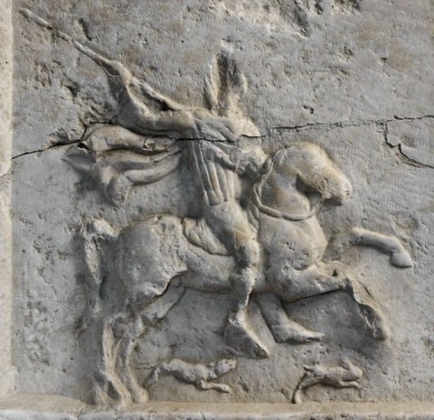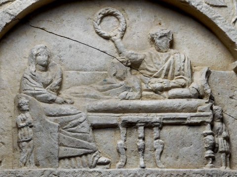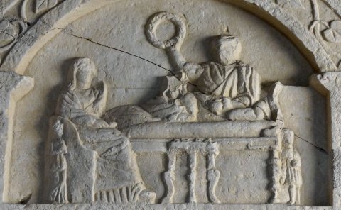 - Oben unter flachem Bogen Totenmahl (Mann mit Kranz in der Rechten auf Kline, Frau im Lehnsessel, Dienerin, Diener, Tischchen mit Speisen). Alle Rahmenleisten mit Efeuranken, über dem Bogen zwei Sternrosetten. Unter der Inschrift Reiter auf der Jagd mit Speer, unter dem Pferd Hund und Hase. Unter dem Schriftfeld Krater mit Blütenranken.
