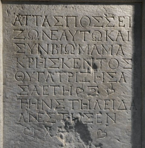 Aττας Πόσσει/ζῶν ἑαυτῷ καὶ / συνβίῳ Μάμᾳ / Κρήσκεντος / θυγατρί, ζησά/σᾳ ἔτη ξʹ / τὴν στηλεῖδα / ἀνέστησεν / χα[ῖρ]ε
