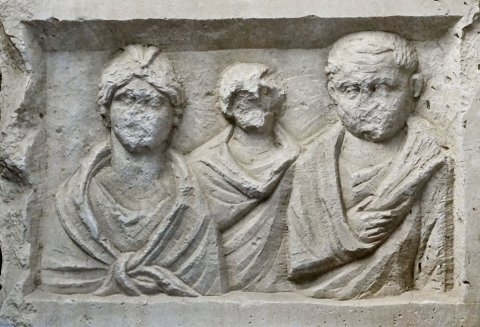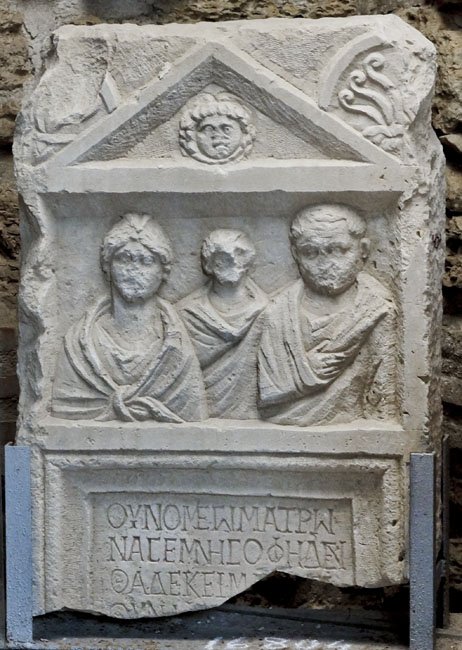 - Halbfiguren einer Familie (Ehepaar mit Sohn). Eingeschriebener Giebel mit Gorgoneion und Palmettenakroteren.