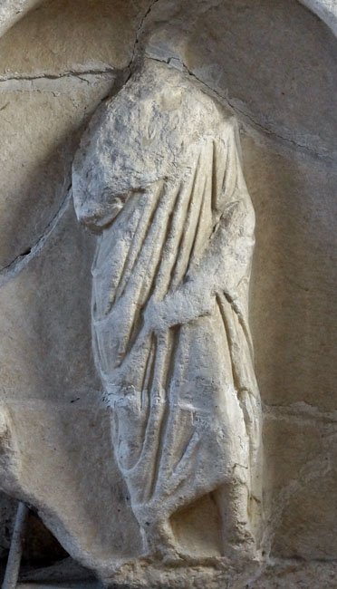 - In Bogennische stehender Mann im Mantel, in der Linken Rolle (volumen ?), links Rest einer Knabenfigur (Diener).