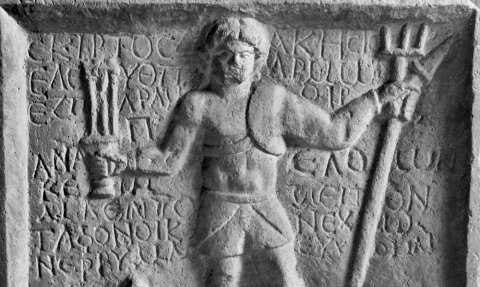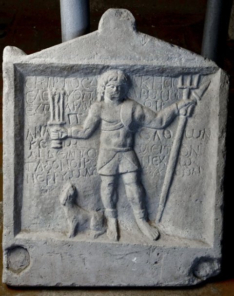 - Feld mit Relief und Inschrift. Stehender Gladiator (retiarius) mit Waffen (Dreizack, Dolch, Armschutz), neben dem rechten Fuß Hund, Inschrift zu beiden Seiten der Figur. Unverzierter Giebel mit Akroteren.