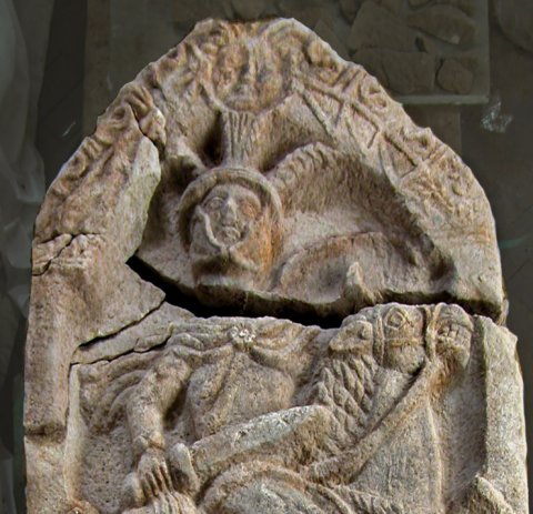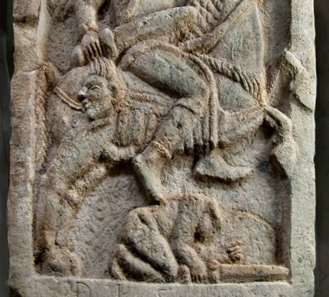 - Reitersoldat mit Mantel, Hosen und Stiefeln nach rechts über geköpften Barbaren hinwegreitend. Er hält in der Rechten den Kopf des Gegners. Waffen: Helm, Schwert. Nach unten offener Giebel, auf dem Rahmen oben Gorgoneion, seitlich Ornament.