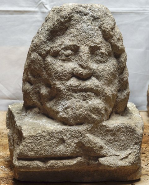 - Kopf mit langen Locken und Vollbart (Gott ?) auf einem Pfeiler.