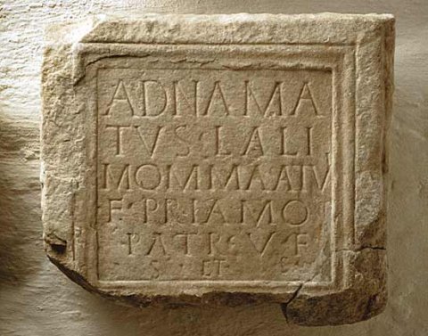 - Adnama/tus Lali (filius) / Momma Atui / f(ilia) Priamo / patr(ono) v(ivi) f(ecerunt) / s(ibi) et s(uis)