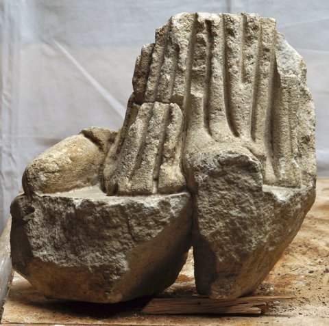 - Plinthe, rechter Fuß, Teil des linken Fußes und Gewandfalten erhalten, zerbrochen