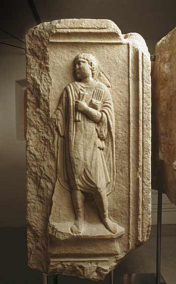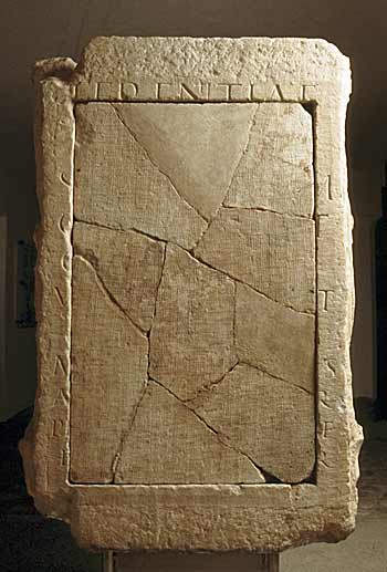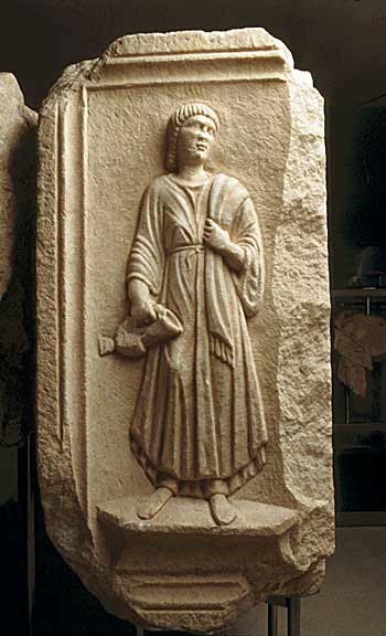 Auf der rechten Nebenseite Diener (Librarius - Scriba): in Rechtecknische auf niedrigem Podest Mann in kurzer Tunica und Paenula, im linken Arm Schreibzeug (Etui mit Rohrfedern), in der Hand Rolle (volumen). - Inschrift