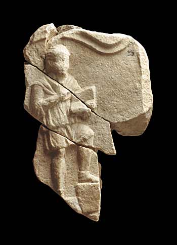 - Diener (Librarius - Scriba): unter geschwungenem Bogen Diener in kurzer Tunica, linkes Bein hochgestellt, schreibt in Diptychon.