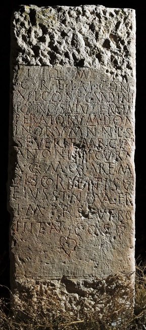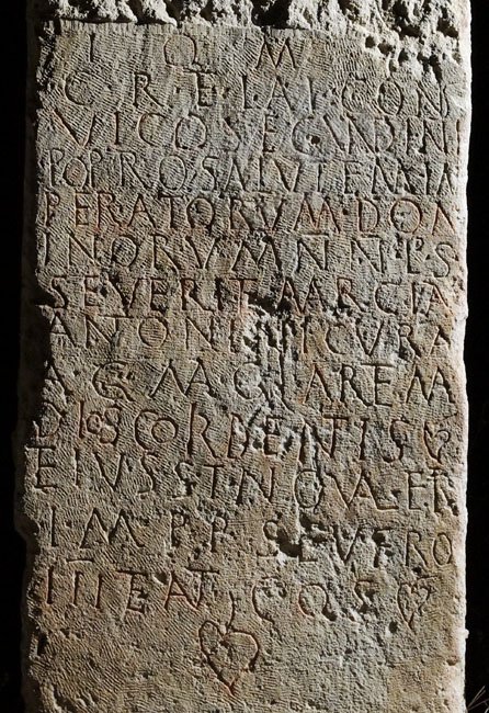 - I(ovi) O(ptimo) M(aximo) / c(ives) R(omani) et Lai cons(istentes) / vico Secundini / po(suerunt) pro salutem(!) Im/peratorum dom/inorum nn(ostrorum) L(uci) S(eptimi) / Severi et Marci A(ureli) / Antonini cura(m) / ag(entibus) mag(istris) Artema / Dioscoridentis(!) / et Iusst(i)no(!) Valeri / Impp(eratoribus) Severo / III et Ant(onino) co(n)s(ulibus)