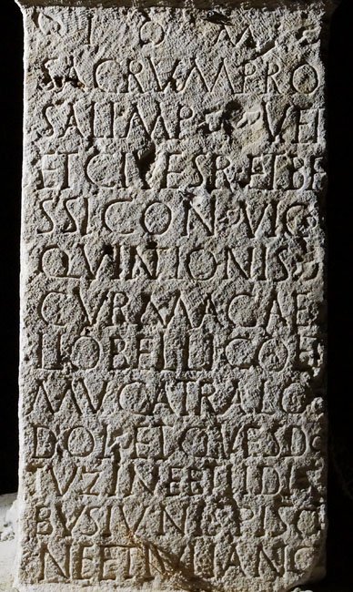 - I(ovi) O(ptimo) M(aximo) / sacrum pro / sal(ute) Imp(eratoris) vet(erani) / et cives R(omani) et Be/ssi con(sistentes) vico / Quintionis / cur(am agentibus) mag(istris) Ae/lio Bellico et / Mucatralo / Doli et qu(a)es(tore) Do/tu Zinebti Idi/bus Iunis Piso/ne et Iuliano // co(n)[s(ulibus)]