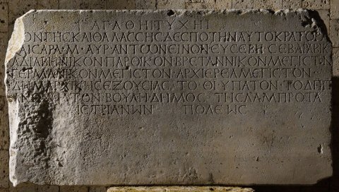ἀγαθῆι ∙ τύχηι ∙ / [τ]ὸν γῆς καὶ θαλάσσης δεσπότην Αὐτοκράτορα / [Κ]αίσαρα ∙ Μ(ᾶρκον) ∙ Αὐρ(ήλιον) ∙ Ἀντωνεῖνον, Εὐσεβῆ ∙ Σεβ(αστὸν) / ∙Ἀραβικ(ὸν) ∙ / Ἀδιαβηνικὸν ∙ Παρθικὸν ∙ Βρεταννικὸν μέγιστον / Γερμανικὸν μέγιστον ∙ ἀρχιερέα μέγιστον ∙ / δημαρχικῆς ἐξουσίας ∙ τὸ ∙ θι ∙ ὕπατον ∙ τὸ ∙ δʹ ∙ π(ατέρα) ∙ π(ατρίδος) / ἀνθ[ύπα]τον ∙ βουλὴ ∙ δῆμος ∙ τῆς λαμπροτά/[τῆς] Ἰστριανῶν πόλεως