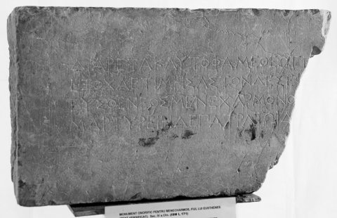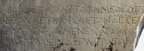 δῖ’ Ἀρετὰ κλυτόφαμε, θεῶγ γ[ένος ἐκγεγαυῖα] / ἔξοχα ἐτίμησας τόνδε σε φ[ιλάμενον] / Εὐσθένεος Μενέχαρμον· ὃ[ν ἐν δαῒ κῦδος ἑλέσθαι] / μαρτυρεῖ ἥδε πάτρα τῶιδ[ε τίουσα λίθωι]