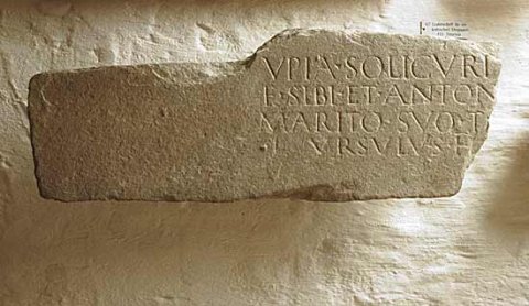 - Upia Solicuri / f(ilia) sibi et Anton[io] / marito suo t(estamento) [ f(ieri) i(ussit?) ] / Ursulus h(eres [f(aciendum) c(uravit) ]