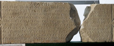 ὑπὲρ τῆς τοῦ κυρίου Αὐτοκράτορος Μ(άρκου) [Αὐρ(ηλίου) Ἀντωνείνο]υ Σεβαστοῦ / Εὐσεβοῦς Εὐτυχοῦς τύχης καὶ Ἰουλία[ς Σεβαστῆς μητρὸ]ς κάστρων / καὶ τῶν κρατίστων ἐπάρχων τοῦ κυρίο<υ> Α[ὐτοκράτορος] Οὐαλερίου / Κωμάζοντος ∙ καὶ Ἰουλίου Φλαβιανοῦ ∙ κ[αὶ ἱερᾶς συγ]κλήτου ∙ καὶ ἱε/ρῶν στρατευμάτων ∙ καὶ ὑπὲρ τοῦ διέπο[ντος τ]ὴν ἐπαρχείαν ∙ ὑ/πατικοῦ ∙ Τ(ίτου) ∙ Φλ(αουίου) ∙ Νοουίου Ῥούφου καὶ βο[υλῆς] καὶ δήμου τῆς / λαμπροτάτης Ἰστριηνῶν πόλεως ∙ [ἡ] σπεῖρα Διονυσι/αστῶν πρεσβυτέρων ∙ οἱ περὶ πατ[έρα] Ἀχιλλ<έ>α Ἀχιλλᾶ / καὶ ἱερέα ∙ Αὐρ(ήλιον) ∙ Βίκτορα Κάστου [καὶ ἱεροφάν]την ∙ Φλ(άουιον) ∙ Ἰου/κοῦνδον ∙ καὶ Φλ(άουιον) ∙ Σεουῆρον κ/[αὶ --- Ἀ]ριστίδην