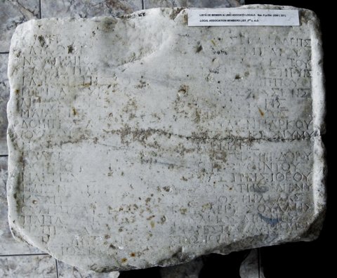 ---] / [----]Τ[․]Υ[---] / [—]Τ[----] / [---]ς Ἐπαφρόδειτος / [Θεόδωρος] Νεικηράτου / Π[ολ]ύσ[τρ]ατος Διοδότου / Σ[ητώνιος] Ῥεστιτοῦτος / [---]ς Φιλίππου / [---]ιος Χρυσίωνος / [Οὔλ]π(ιος) Ἰανουάρις / [Οὔλ]π(ιος) Ἡλιόδωρος / [Κορ]βούλων Μάρκου / [Φί]λιππος Ἱερονύμου / [---] Αἴλ(ιος) Ἑρμῆς / [---]το[γέ]νης Μοιροδώρου / [Κο]ίντος Κοίντου / [---]ισιας Πεισιθέου / [Δημ]οκράτης Θεαγένου / [---]σσιος Ἡρακλᾶς / Γ(άιος) Οὐαλέριος Οὐάλης / Φούλβιος Δέκμος / Εὐάρεστος Οὐλ(πίου) Ἀρτεμιδώρου / Χρυσίων Νέσ[τορος] / ΙΙΝΣ[---] / [---