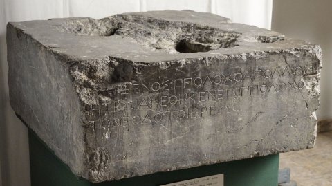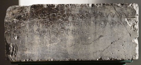 [Θε]όξενος Ἱππολόχο Ἀπόλλωνι / Ἰητρῶι ἀνέθηκεν ἐπὶ Ἱππολόχο / το̑ Θεοδότο ἱέρεω