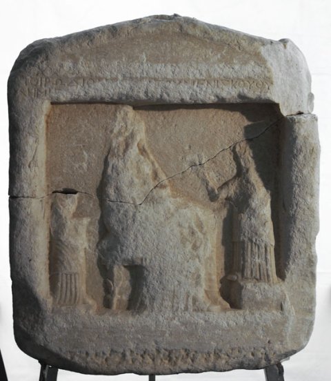 - Mythische Figur: Aedicula mit Giebel, zwischen Säulen thronende Demeter mit zwei Dienerinnen.