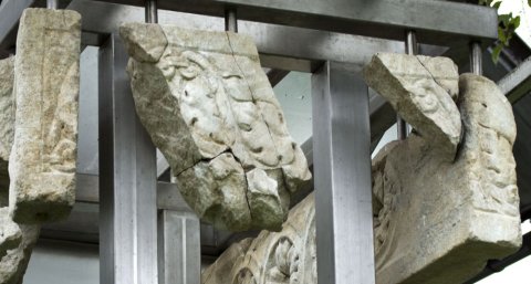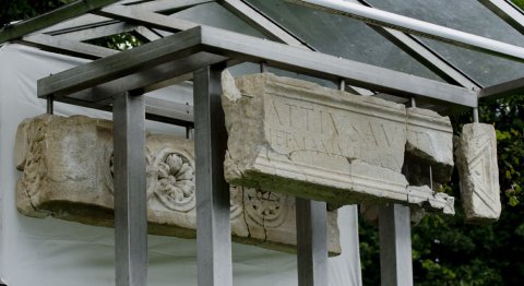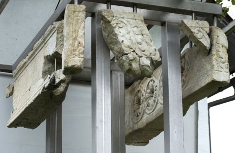 Fragmente der oberen Abschlussbalken von Rückwand und Seitenwangen einer Aedicula.