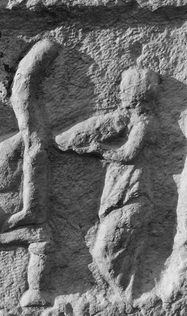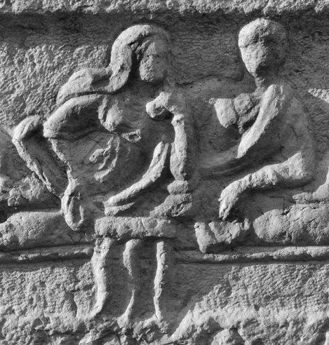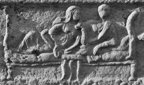 - Totenmahl: Ehepaar auf Kline, seitlich je eine Dienerin
